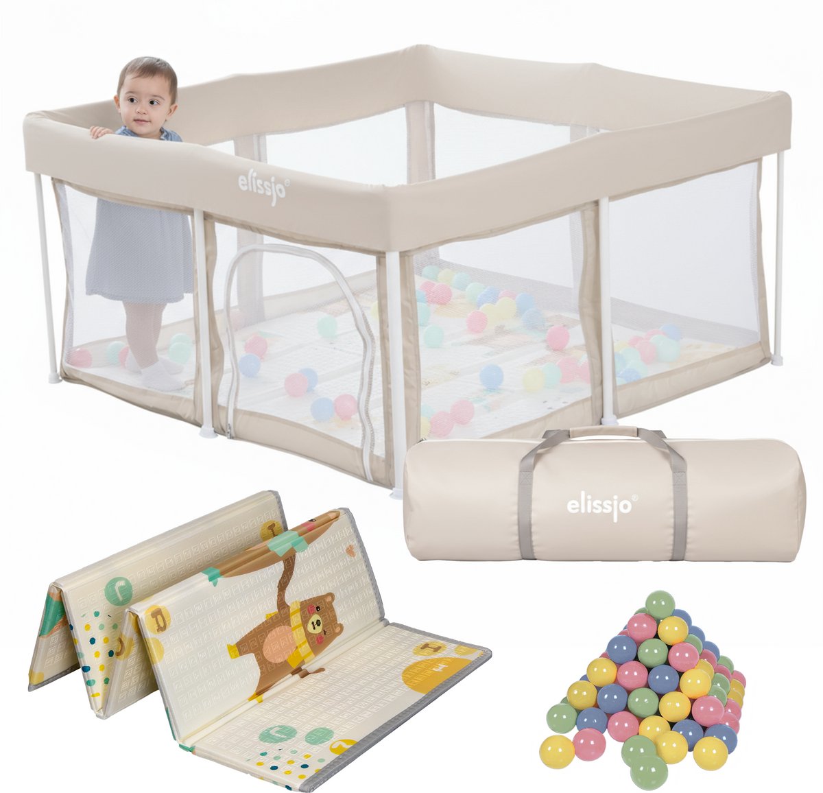 Elissio® – Grondbox Baby – Inklapbare Speelbox met Dubbelzijdige Speelmat & 50 Ballen – Kruipbox – Kinderbox – Playpen Baby – 125x125x65 CM – Beige
